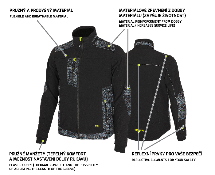 • materiálové zpevnění z odolného DOBBY materiálu v namáhané části ramen, loktů a kapes zvyšuje životnost bundy