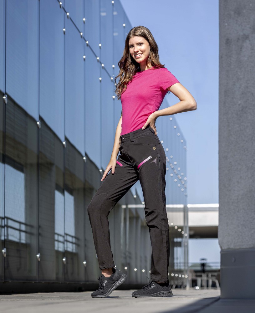 Dámske softshellové nohavice majú priliehavý strih SLIM FIT. Štvorsmerne elastický ľahký softshell ElasticTech®Flexi s membránou je vhodný aj na náročné aktivity, poskytuje vynikajúcu ochranu proti vetru, je nepremokavý, rýchlo schne a udržiava optimálnu telesnú teplotu. Vetracie zipsy so sieťovinou na vonkajšej strane stehien. Chrbát je rozdelený sedlom, 2 vrecká na zips na prednej strane, elastický, tvarovaný pás zvyšuje pohodlie pri nosení. Funkčné tvarovanie nohavíc, zúžený strih, lem nohavíc s možnosťou úpravy obvodu pomocou gombíkov, vnútorný háčik s gumičkou na zapínanie nohavíc na topánky. Dizajn je ozvláštnený 3D reflexnými potisky